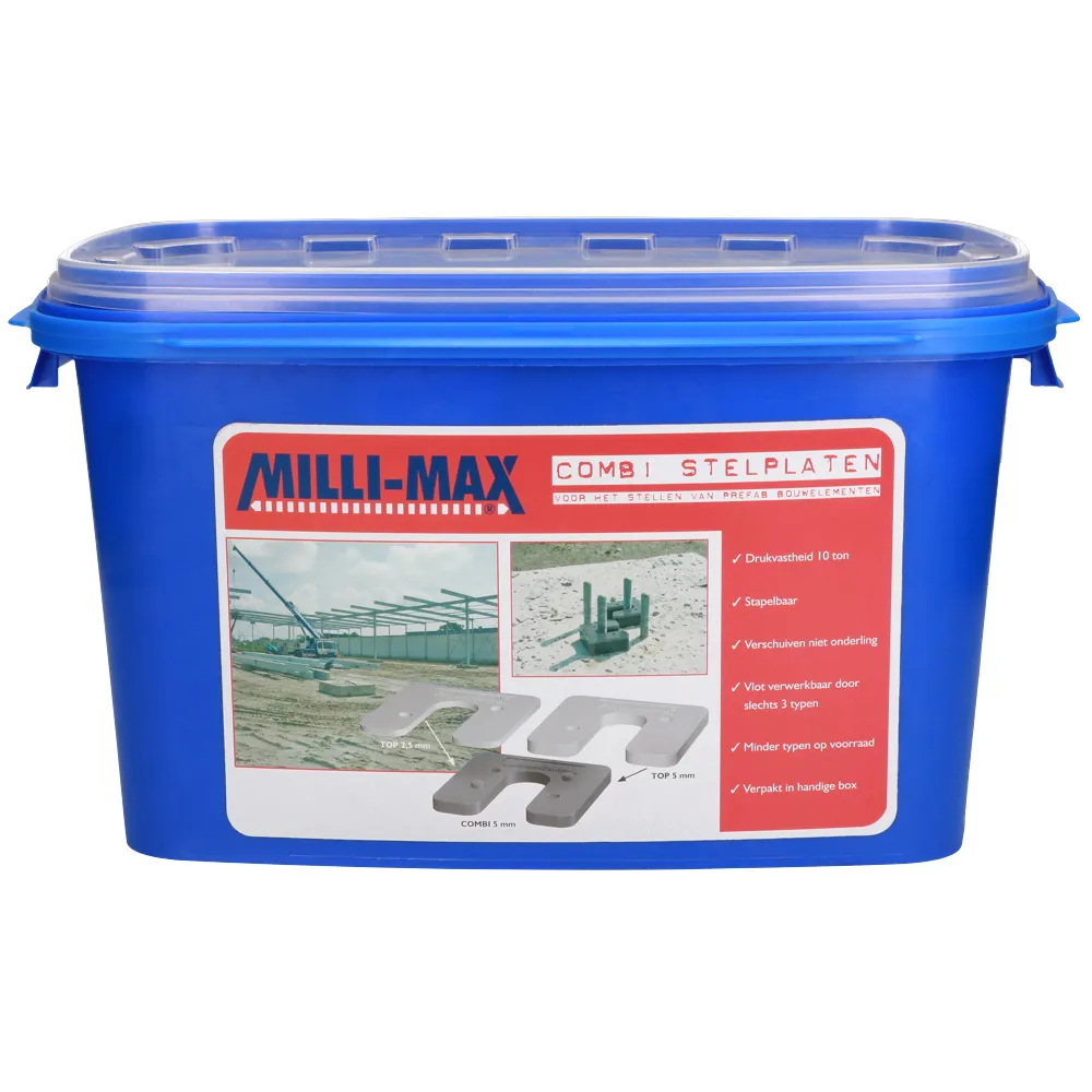 Combi stelplaten zijn ideaal voor het stellen van prefab bouwelementen zoals: gevelelementen, vloeren, kolommen, systeemwanden, betonnen elementen en balklagen . Door middel van een uniek klik-systeem kun je de stelplaten stapelen tot elke gewenste hoogte! Combi stelplaten zijn er zowel in U-vorm als in dichte vorm. De U-vormige stelplaten zijn vooral geschikt voor plaatsing rondom gestorte draadeinden of chemische ankers.